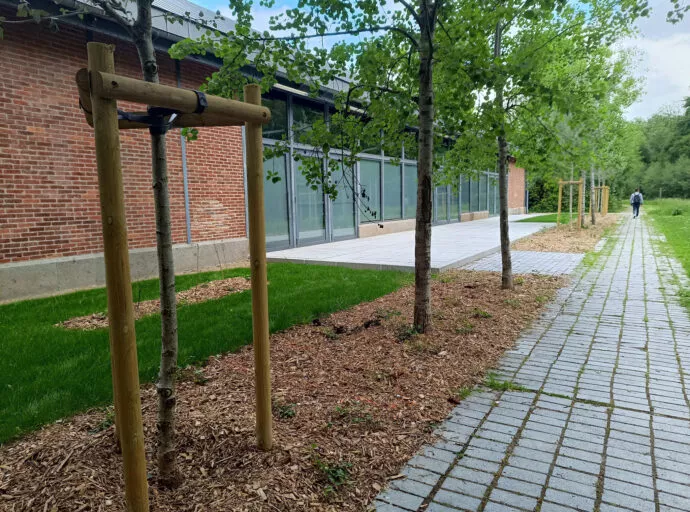La Halle de la Courrouze, lieu emblématique de Rennes dédié aux événements professionnels et culturels, a récemment transformé ses espaces extérieurs pour offrir un cadre encore plus accueillant et fonctionnel. Autrefois dotée d’une terrasse en bois de 130 m², la Halle propose désormais un espace extérieur entièrement repensé, associant une terrasse en granit et un espace vert totalisant 225 m².
