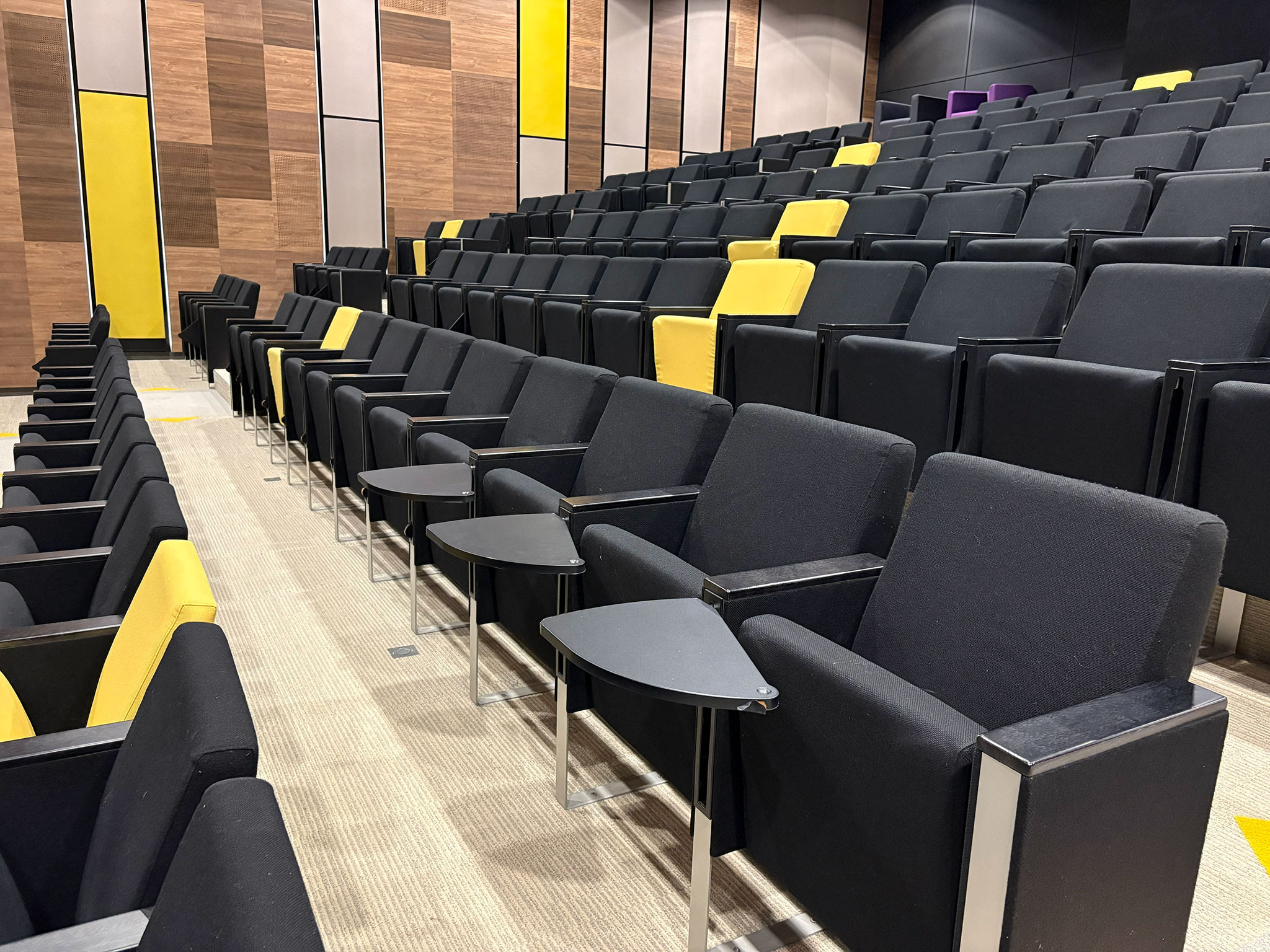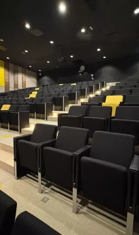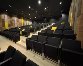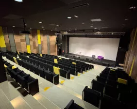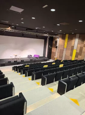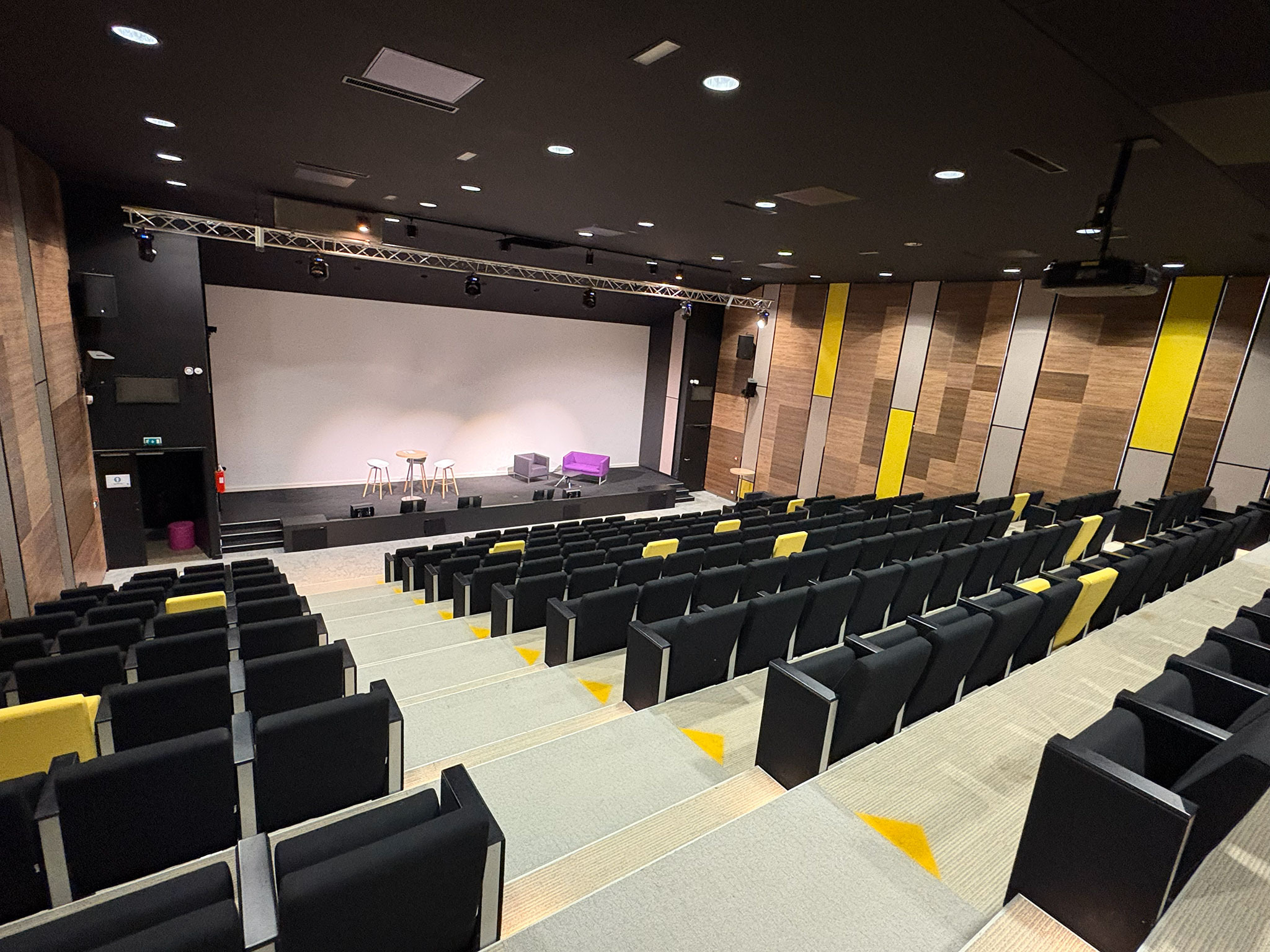 Un auditorium de 199 places, entièrement équipé pour répondre aux exigences technologiques : scène, sonorisation, vidéoprojection, éclairage, mobilier et régie intégrée.